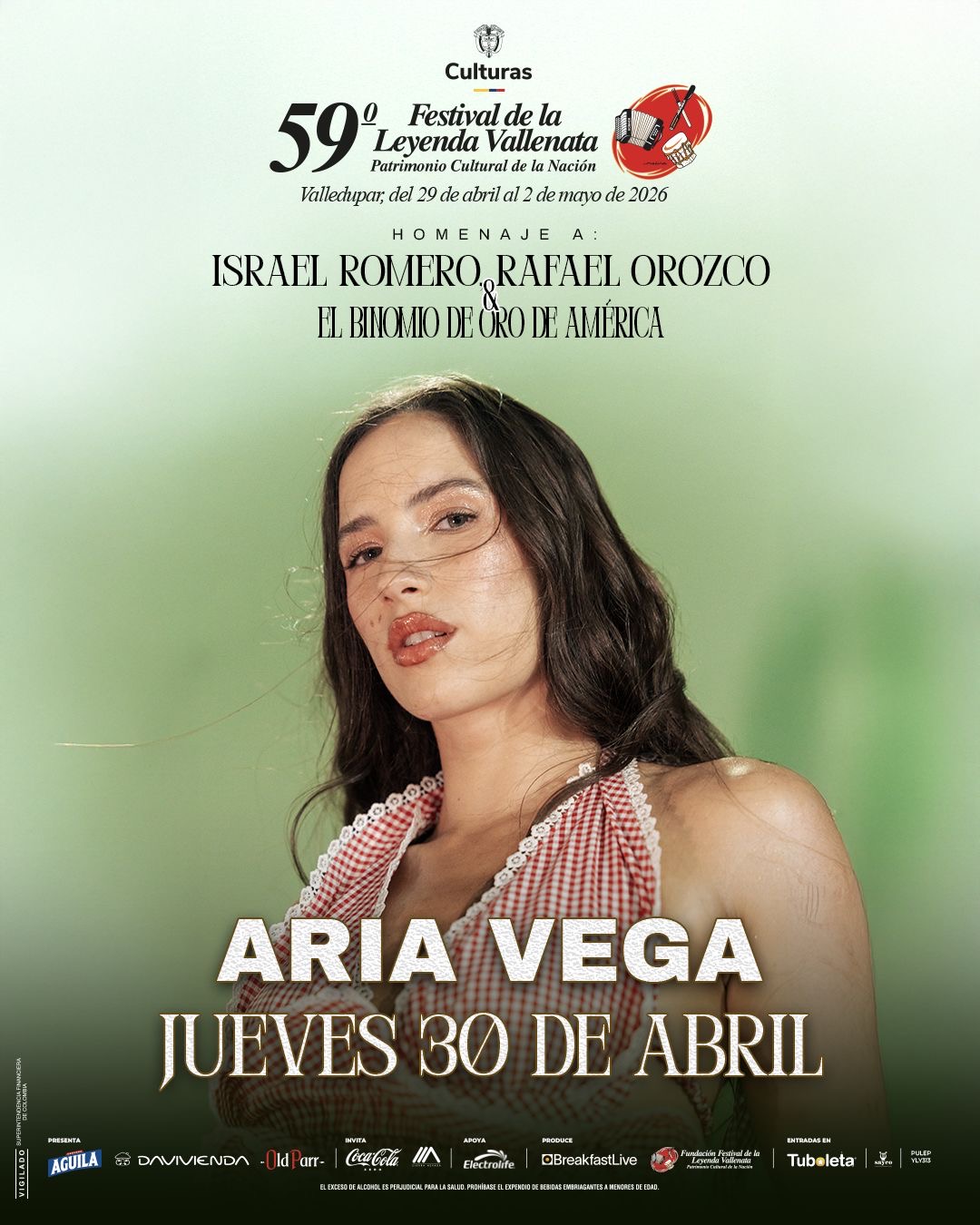 La artista colombiana Aria Vega confirma su participación en la versión 59 del Festival de la Leyenda Vallenata, uno de los encuentros culturales y musicales más importantes del país, que se celebrará en Valledupar del 29 de abril al 2 de mayo de 2026.